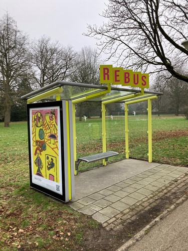 Op zorgpark Voorburg in Vught staat een bijzondere bushalte, de rebushalte. Deze halte dient niet alleen als tijdelijke wachtruimte, maar ook als wisselende expositieruimte. Elke twee maanden komen er twee nieuwe posters in de verlichte reclamevitrine met daarop werken van een kunstenaar van het Living Museum Vught. Via een QR-code kun je ook nog eens luisteren naar de podcast met die kunstenaar.
